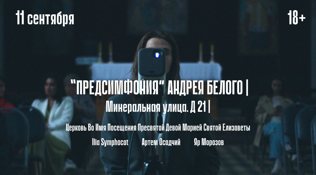 Проект «Предсимфония» представляет собой междисциплинарный спектакль, вдохновлённый первым экспериментом в жанре симфонических поэм великого русского символиста Андрея Белого. Чистовик произведения был сожжен автором, но черновая редакция дошла до наших дней и даёт нам возможность представить его через 100 лет.Зрителя приглашают погрузиться в атмосферу космических, духовных образов Андрея Белого, познакомиться с одним из самых необычных произведений Серебряного века. В стенах прекраcного готического храма на минеральной улице, построенного известнейшим архитектором Н.Л Бенуа. Эстетика церкви идеально сочетается с произведением и создателями спектакля.